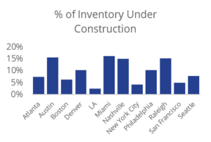 Keeping with demand drivers, developers in the region are introducing additional supply at a historic pace, with 6.4% of existing inventory currently under construction. This additional supply may lead to some rent relief in the area, a welcome event to area renters suffering from rent fatigue, but Boston’s growth pales in comparison to other growing cities like Austin or Miami, which are building mid-teens or more of the current housing inventory. A significant increase in housing supply must be added to Boston’s inventory to keep housing affordable.