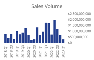 Capital markets saw unprecedented volatility, with seven straight interest rate hikes by the Fed, causing the Federal Funds rate to jump from 0.25% to 4.5% in just nine months, with an additional 50bps coming in Q1. The dramatic increase in interest rates caused institutional lending to all but dry up and local and regional lending standards to tighten up significantly. The rate increases were exacerbated by the failure of Silicon Valley Bank on March 10th, which sent shockwaves through the regional banking system. While sourcing capital in the debt markets is proving challenging, a staggering amount of private capital remains on the sidelines. Real Estate Alert reported 603 funds are seeking $619 billion in equity and have already raised $395 billion.1