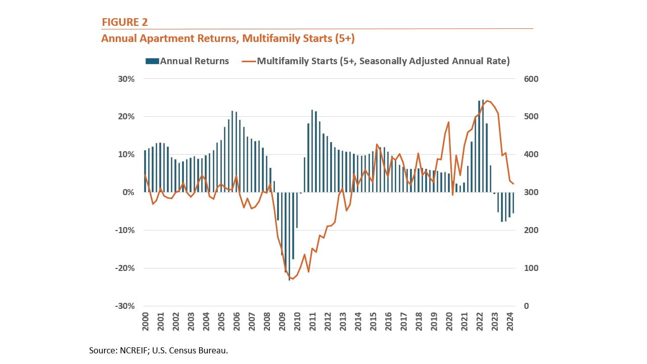 Record-high rent growth in late 2021 and early 2022 was followed by the highest level of multifamily construction since the late 1980s. Multifamily starts rose 14.9% in 2022 to 531,000 units, according to data from the U.S. Census Bureau, their highest level since 1986. A logical conclusion would be that this rent growth fueled developer interest in the asset class, causing construction to increase. This conclusion is also reinforced by the fact that in many metro areas where a lot of development has been occurring, starts have begun to decrease significantly.